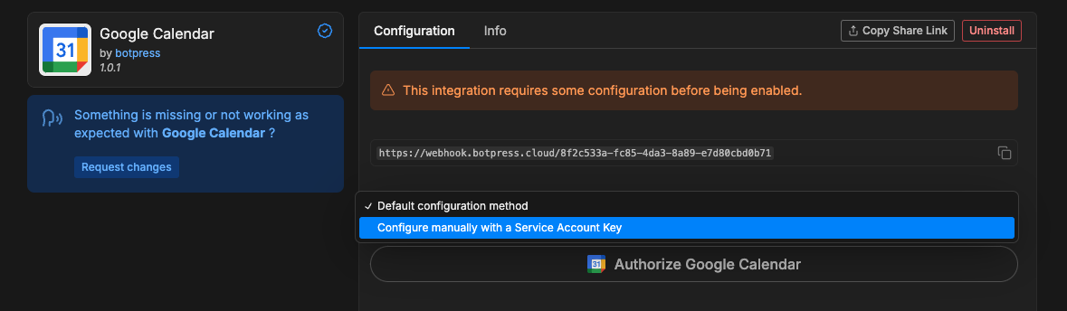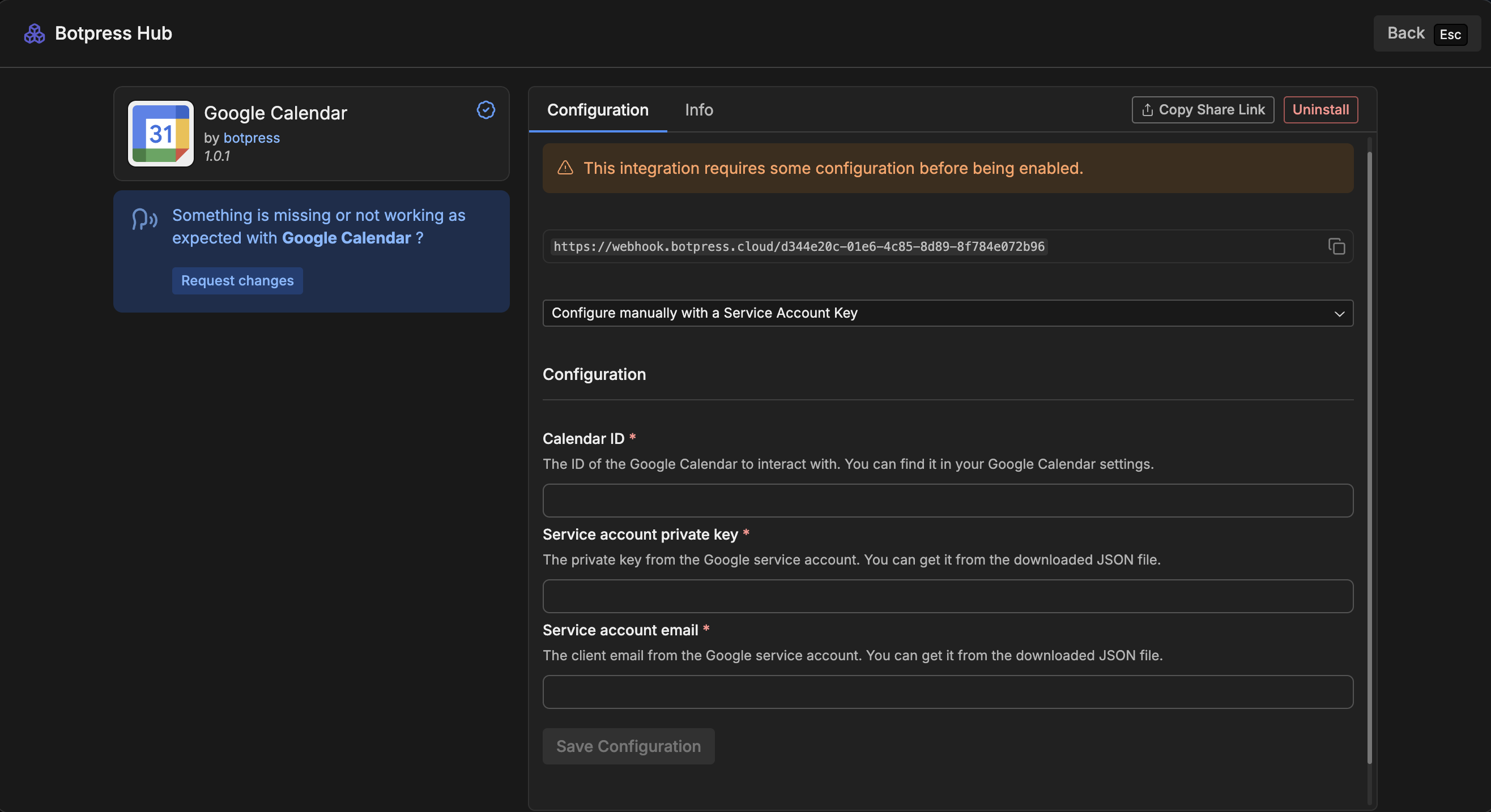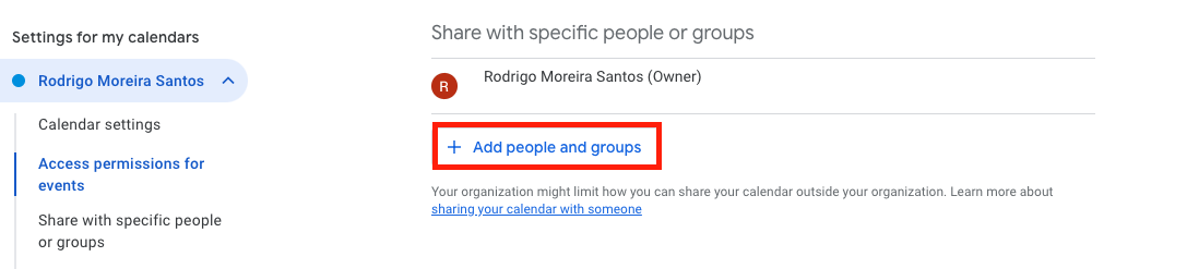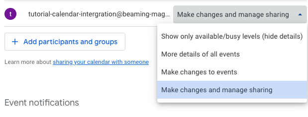 - After selecting the calendar, you should add the email that the bot uses in its integration
