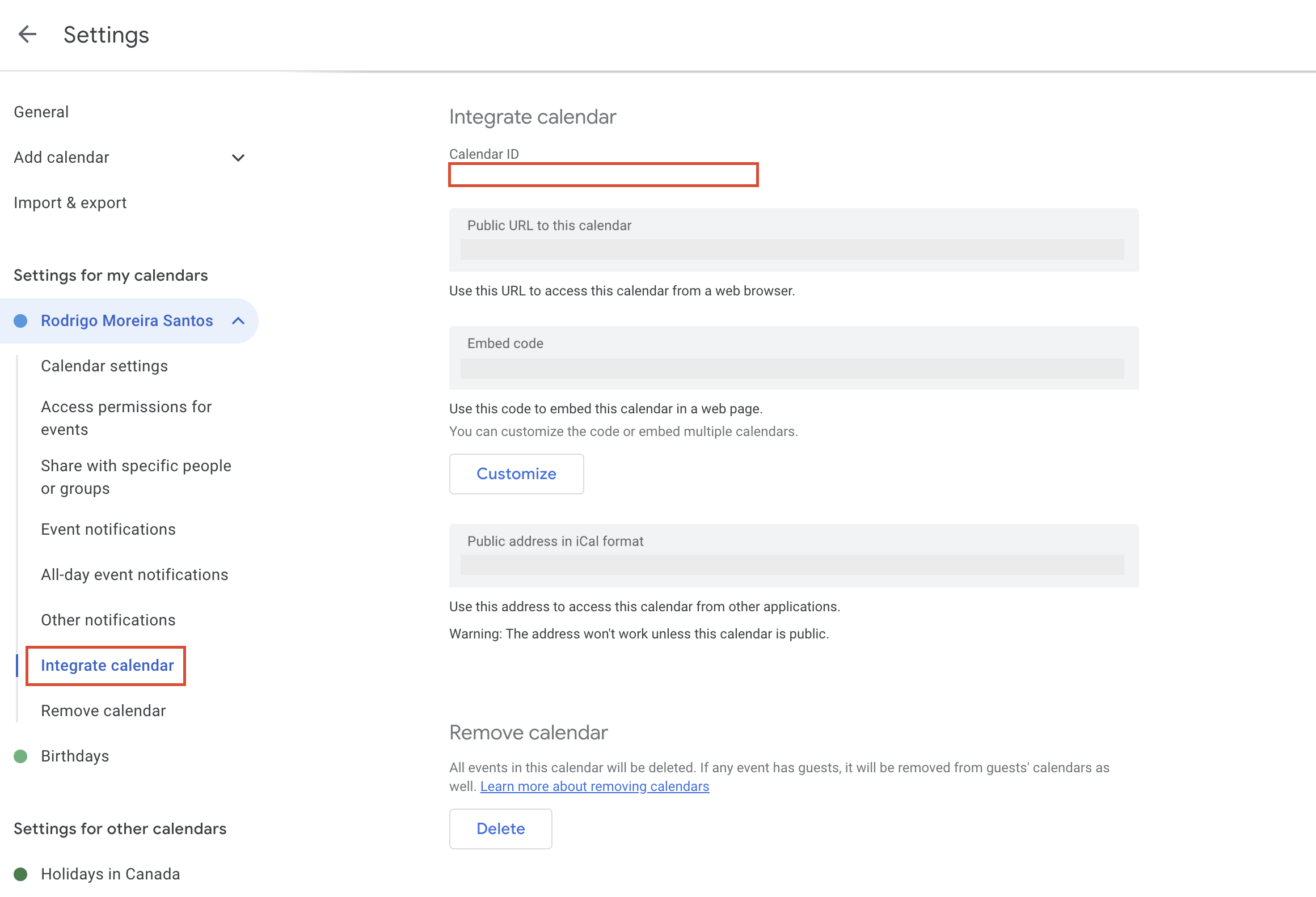 - Select your calendar → Integrate calendar, you will find your Calendar ID as shown in the image below