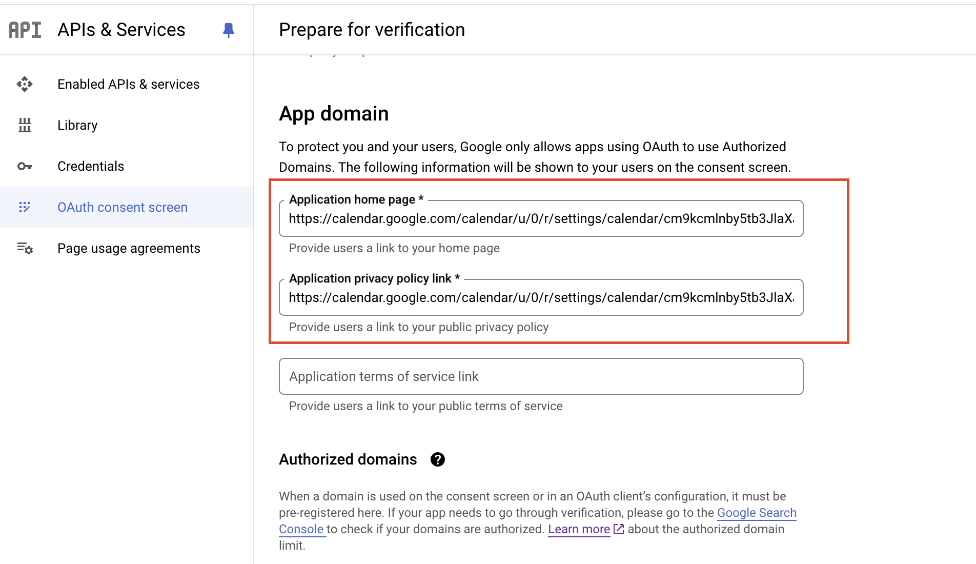 - Further down, you’ll need to create the App domain, where you’ll need to enter the URL of your calendar for both the Application home page and Application privacy policy link. But if you have another URL for this information, you can use it