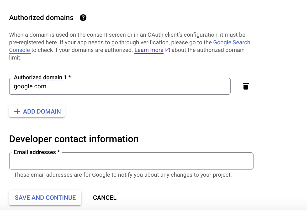 - In Authorized domain, you’ll need to add at least google.com as shown in the image below