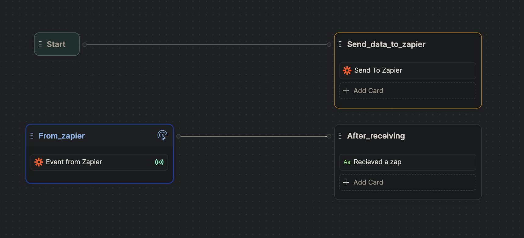 You can create an “echo” zap in Zapier to test if everything works well. For example, you can create a zap that triggers when you send a message to your bot and then sends the same message back to your bot.Here’s what a simple echo zap would look like: